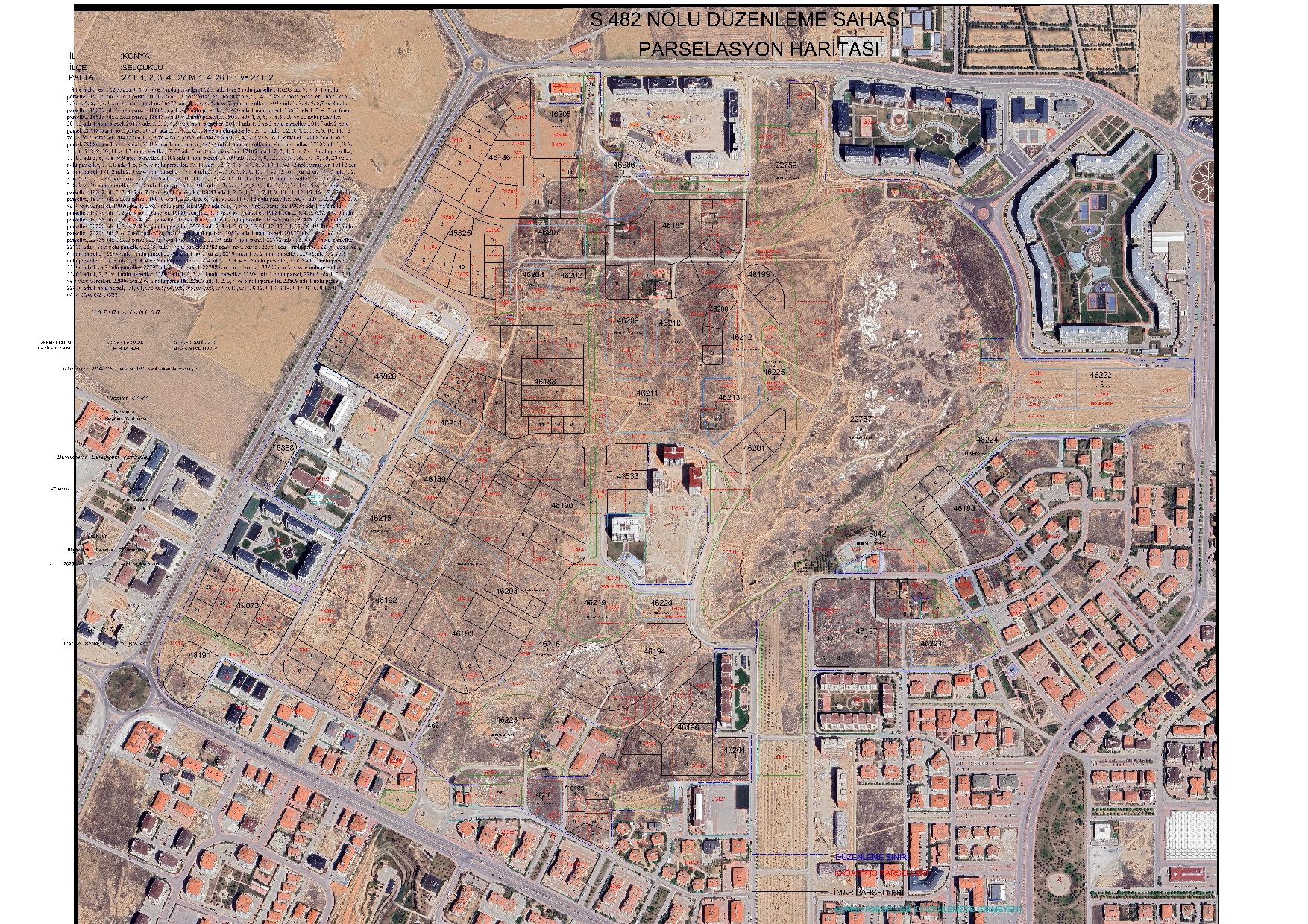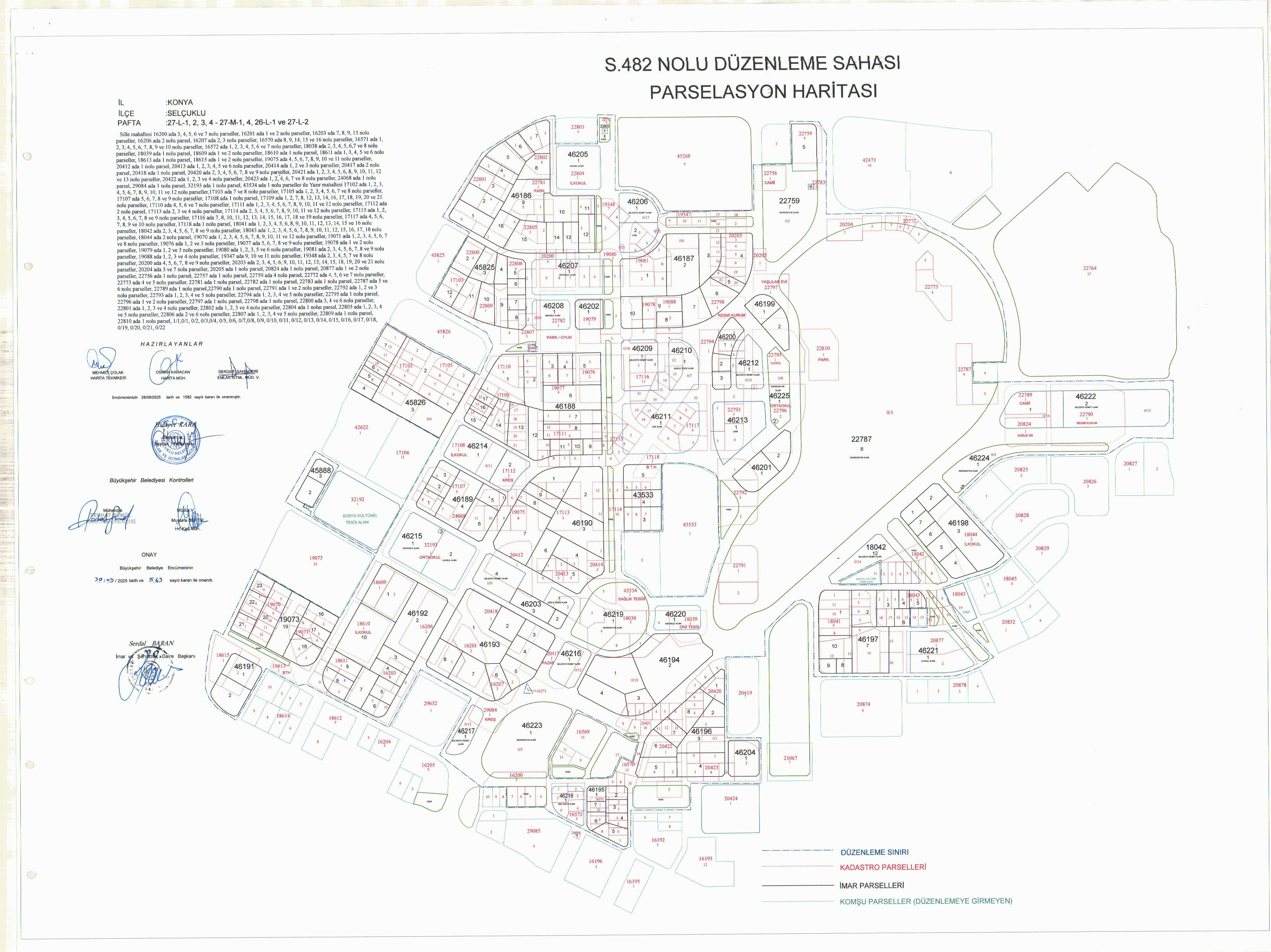 Selçuklu İlçesi Sille ve Yazır Mahallesinde 27-L-1, 27-L-2, 27-L-3, 27-L-4, 27-M-1, 27-M-4, 26- L-1 ve 27-L-2 paftalarına isabet eden, Konya Büyükşehir Belediyesinin 17/01/2025 tarih ve 80 sayılı Meclis Kararı ile plan revizyonu yapılan bölgede, ekli haritasında görüldüğü üzere düzenleme sınırları içerisinde kalan, Sille Mahallesi 16200 ada 3, 4, 5, 6 ve 7 nolu parseller, 16201 ada 1 ve 2 nolu parseller, 16203 ada 7, 8, 9, 15 nolu parseller, 16206 ada 2 nolu parsel, 16207 ada 2, 3 nolu parseller, 16570 ada 8, 9, 14, 15 ve 16 nolu parseller, 16571 ada 1, 2, 3, 4, 5, 6, 7, 8, 9 ve 10 nolu parseller, 16572 ada 1, 2, 3, 4, 5, 6 ve 7 nolu parseller, 18038 ada 2, 3, 4, 5, 6, 7 ve 8 nolu parseller, 18039 ada 1 nolu parsel, 18609 ada 1 ve 2 nolu parseller, 18610 ada 1 nolu parsel, 18611 ada 1, 3, 4, 5 ve 6 nolu parseller, 18613 ada 1 nolu parsel, 18615 ada 1 ve 2 nolu parseller, 19075 ada 4, 5, 6, 7, 8, 9, 10 ve 11 nolu parseller, 20412 ada 1 nolu parsel, 20413 ada 1, 2, 3, 4, 5 ve 6 nolu parseller, 20414 ada 1, 2 ve 3 nolu parseller, 20417 ada 2 nolu parsel, 20418 ada 1 nolu parsel, 20420 ada 2, 3, 4, 5, 6, 7, 8 ve 9 nolu parseller, 20421 ada 1, 2, 3, 4, 5, 6, 8, 9, 10, 11, 12 ve 13 nolu parseller, 20422 ada 1, 2, 3 ve 4 nolu parseller, 20423 ada 1, 2, 4, 6, 7 ve 8 nolu parseller, 24068 ada 1 nolu parsel, 29084 ada 1 nolu parsel, 32193 ada 1 nolu parsel, 43534 ada 1 nolu parseller ile Yazır Mahallesi 17102 ada 1, 2, 3, 4, 5, 6, 7, 8, 9, 10, 11 ve 12 nolu parseller,17103 ada 7 ve 8 nolu parseller, 17105 ada 1, 2, 3, 4, 5, 6, 7 ve 8 nolu parseller, 17107 ada 5, 6, 7, 8 ve 9 nolu parseller, 17108 ada 1 nolu parsel, 17109 ada 1, 2, 7, 8, 12, 13, 14, 16, 17, 18, 19, 20 ve 21 nolu parseller, 17110 ada 4, 5, 6 ve 7 nolu parseller, 17111 ada 1, 2, 3, 4, 5, 6, 7, 8, 9, 10, 11 ve 12 nolu parseller, 17112 ada 2 nolu parsel, 17113 ada 2, 3 ve 4 nolu parseller, 17114 ada 2, 3, 4, 5, 6, 7, 8, 9, 10, 11 ve 12 nolu parseller, 17115 ada 1, 2, 3, 4, 5, 6, 7, 8 ve 9 nolu parseller, 17116 ada 7, 8, 10, 11, 12, 13, 14, 15, 16, 17, 18 ve 19 nolu parseller, 17117 ada 4, 5, 6, 7, 8, 9 ve 10 nolu parseller, 17118 ada 1 nolu parsel, 18041 ada 1, 2, 3, 4, 5, 6, 8, 9, 10, 11, 12, 13, 14, 15 ve 16 nolu parseller, 18042 ada 2, 3, 4, 5, 6, 7, 8 ve 9 nolu parseller, 18043 ada 1, 2, 3, 4, 5, 6, 7, 8, 9, 10, 11, 12, 15, 16, 17, 18 nolu parseller, 18044 ada 2 nolu parsel, 19070 ada 1, 2, 3, 4, 5, 6, 7, 8, 9, 10, 11 ve 12 nolu parseller, 19071 ada 1, 2, 3, 4, 5, 6, 7 ve 8 nolu parseller, 19076 ada 1, 2 ve 3 nolu parseller, 19077 ada 5, 6, 7, 8 ve 9 nolu parseller, 19078 ada 1 ve 2 nolu parseller, 19079 ada 1, 2 ve 3 nolu parseller, 19080 ada 1, 2, 3, 5 ve 6 nolu parseller, 19081 ada 2, 3, 4, 5, 6, 7, 8 ve 9 nolu parseller, 19088 ada 1, 2, 3 ve 4 nolu parseller, 19347 ada 9, 10 ve 11 nolu parseller, 19348 ada 2, 3, 4, 5, 7 ve 8 nolu parseller, 20200 ada 4, 5, 6, 7, 8 ve 9 nolu parseller, 20203 ada 2, 3, 4, 5, 6, 9, 10, 11, 12, 13, 14, 15, 18, 19, 20 ve 21 nolu parseller, 20204 ada 3 ve 7 nolu parseller, 20205 ada 1 nolu parsel, 20824 ada 1 nolu parsel, 20877 ada 1 ve 2 nolu parseller, 22756 ada 1 nolu parsel, 22757 ada 1 nolu parsel, 22759 ada 4 nolu parsel, 22772 ada 4, 5, 6 ve 7 nolu parseller, 22773 ada 4 ve 5 nolu parseller, 22781 ada 1 nolu parsel, 22782 ada 1 nolu parsel, 22783 ada 1 nolu parsel, 22787 ada 5 ve 6 nolu parseller, 22789 ada 1 nolu parsel, 22790 ada 1 nolu parsel, 22791 ada 1 ve 2 nolu parseller, 22792 ada 1, 2 ve 3 nolu parseller, 22793 ada 1, 2, 3, 4 ve 5 nolu parseller, 22794 ada 1, 2, 3, 4 ve 5 nolu parseller, 22795 ada 1 nolu parsel, 22796 ada 1 ve 2 nolu parseller, 22797 ada 1 nolu parsel, 22798 ada 1 nolu parsel, 22800 ada 3, 4 ve 6 nolu parseller, 22801 ada 1, 2, 3 ve 4 nolu parseller, 22802 ada 1, 2, 3 ve 4 nolu parseller, 22804 ada 1 noluı parsel, 22805 ada 1, 2, 3, 4 ve 5 nolu parseller, 22806 ada 2 ve 6 nolu parseller, 22807 ada 1, 2, 3, 4 ve 5 nolu parseller, 22809 ada 1 nolu parsel, 22810 ada 1 nolu parselde, S.482 nolu düzenleme sahası adı altında 3194 Sayılı İmar Kanununun 18. madde uygulaması için düzenleme yapılıp, Selçuklu Belediye Encümeninin 28/08/2025 tarih ve 1581 sayılı kararı ile onanmıştır. Parselasyon planı, özet, dağıtım ve tahsis cetvelleriBelediyemizin 2. katında 17/10/2025 tarihinden itibaren 1 ay süreyle askıya çıkarılmıştır.