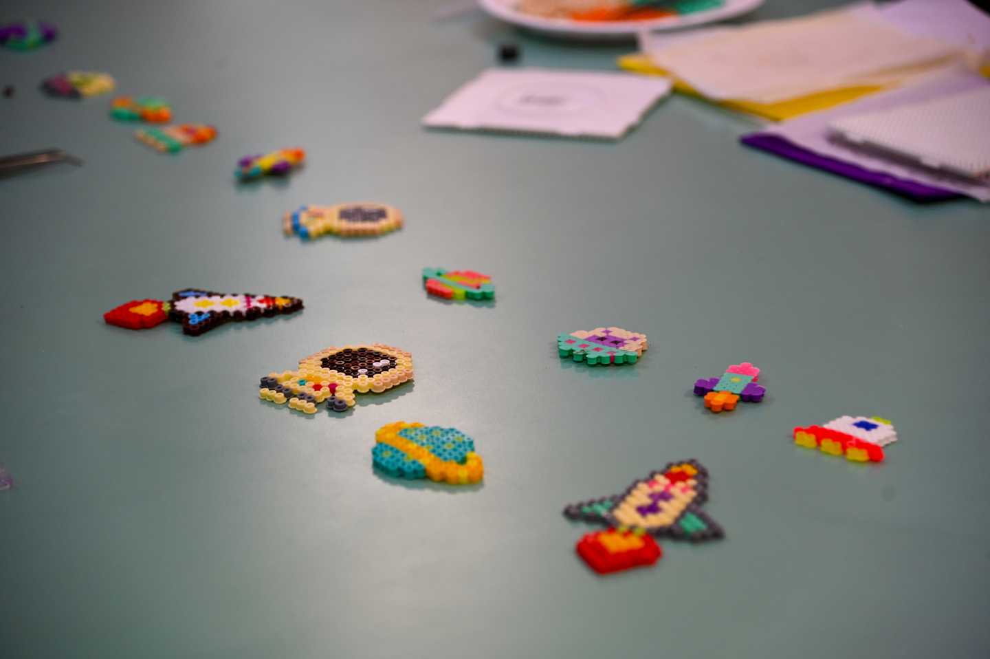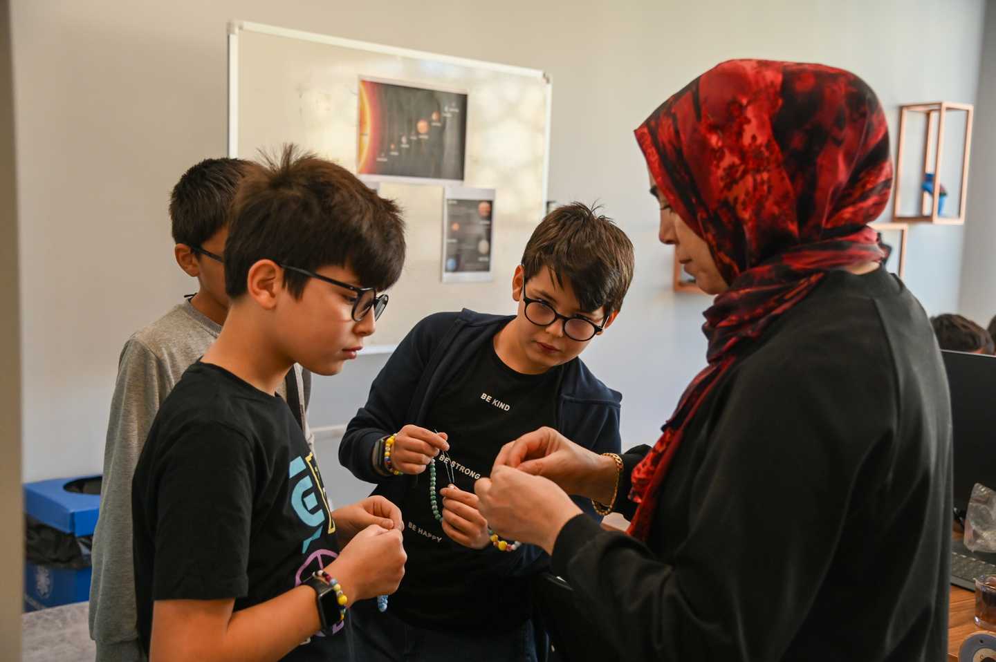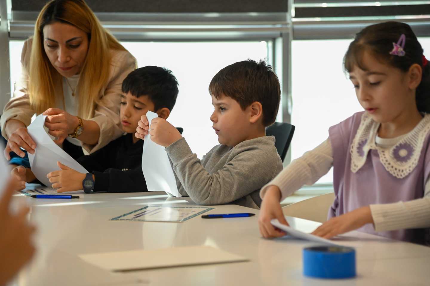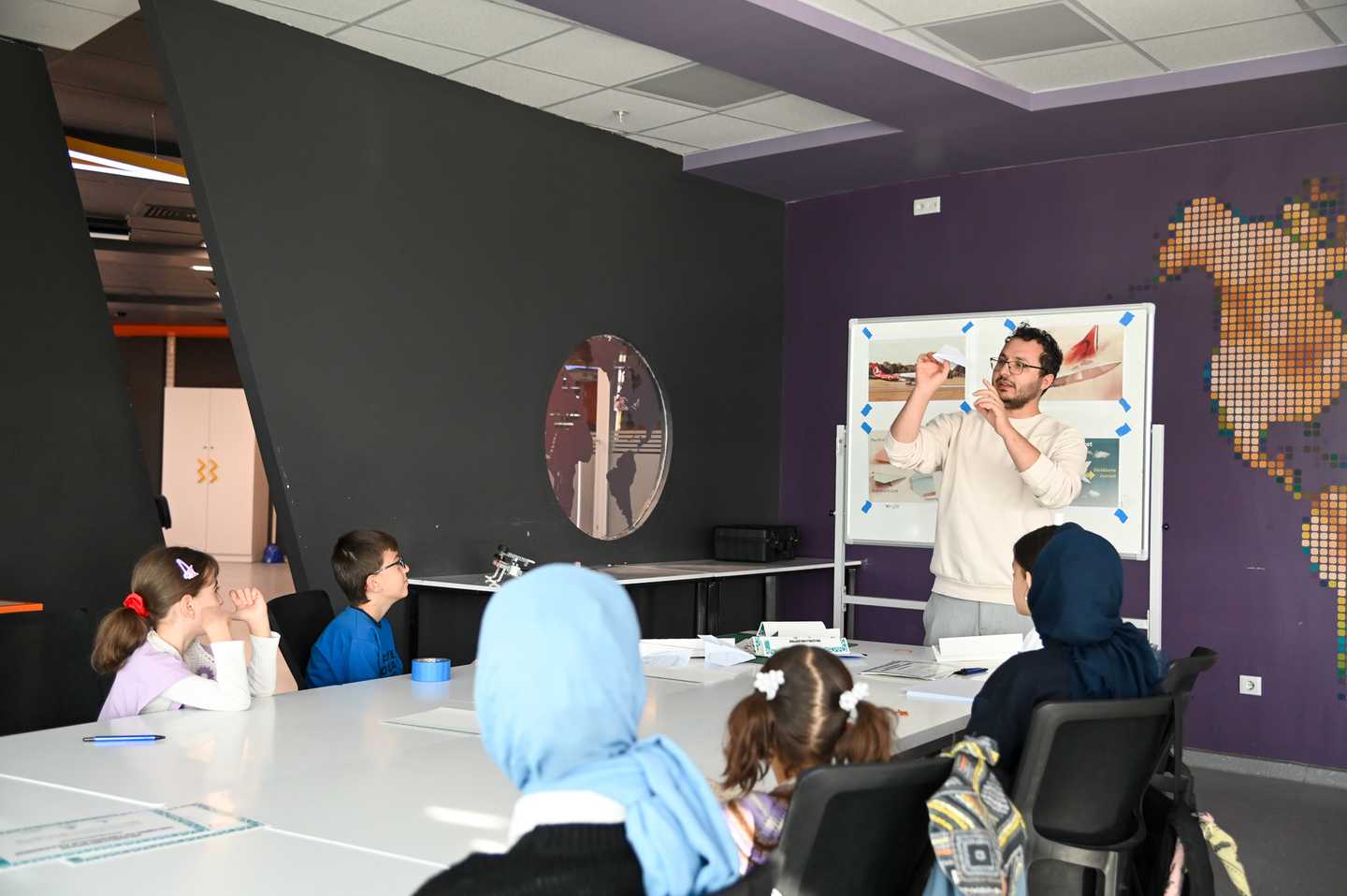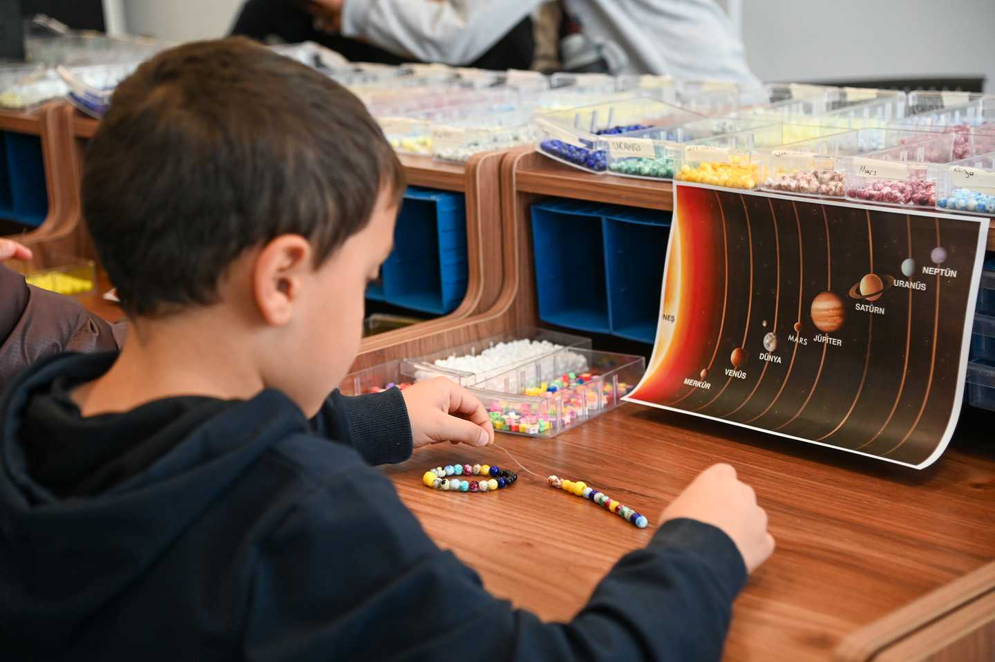 Oyuncak Üretim Atölyesi’nde hama boncuklarla uzay temalı pixel art magnetler hazırlayan çocuklar, kendi tasarımlarını üretti. Havacılık ve Uzay Bilimleri Atölyesi’nde kağıt uçak tasarımı ve uçuş prensiplerini öğrenen minikler, Lego EV3 setleriyle kağıt uçak fırlatan robotik sistemler kurdu. Mekatronik Atölyesi’nde ise öğrenciler, uzay temalı parkurda görevleri yerine getiren robotları kodladı. Takı Tasarım Atölyesi’ne katılan çocuklar da Güneş Sistemi hakkında bilgi edindikten sonra gezegenleri temsil eden boncuklarla bileklik tasarladı.