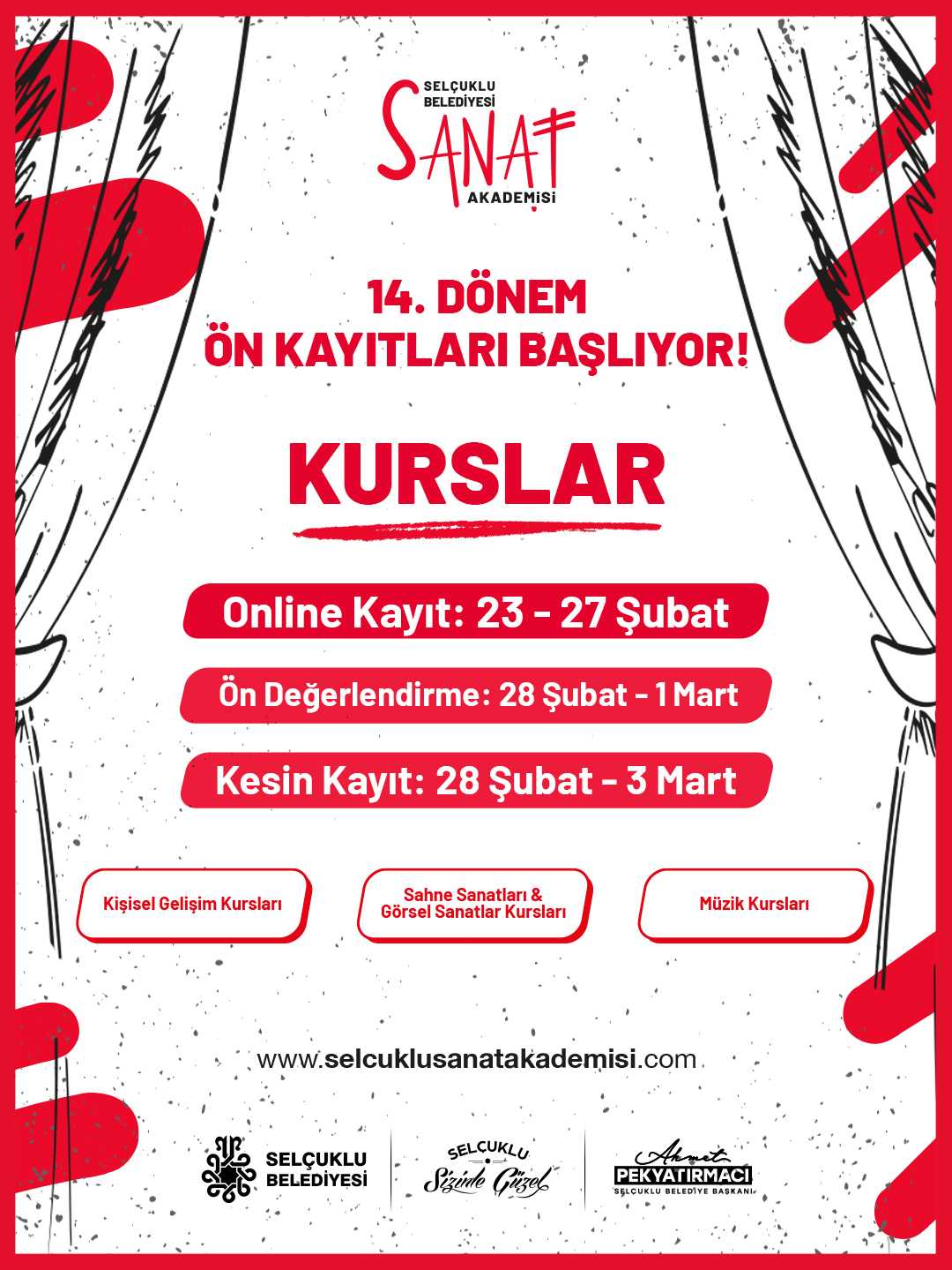 Selçuklu Sanat Akademisi’nin 14. dönem ön kayıtları başladı. Başvurular 27 Şubat’ta sona erecek. Kesin kayıt işlemleri ise 28 Şubat – 3 Mart tarihleri arasında gerçekleştirilecek.